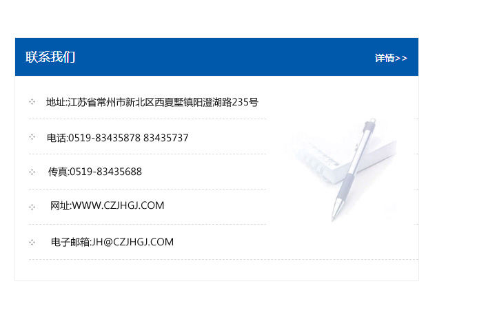 傳真:0519-83435688    郵編:213135    網址:WWW.czjhgj_com.swonr.com    電子郵箱:JH@czjhgj_com.swonr.com